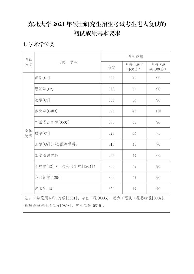 東北大學2021年碩士研究生招生考試考生進入復試的初試成績基本要求