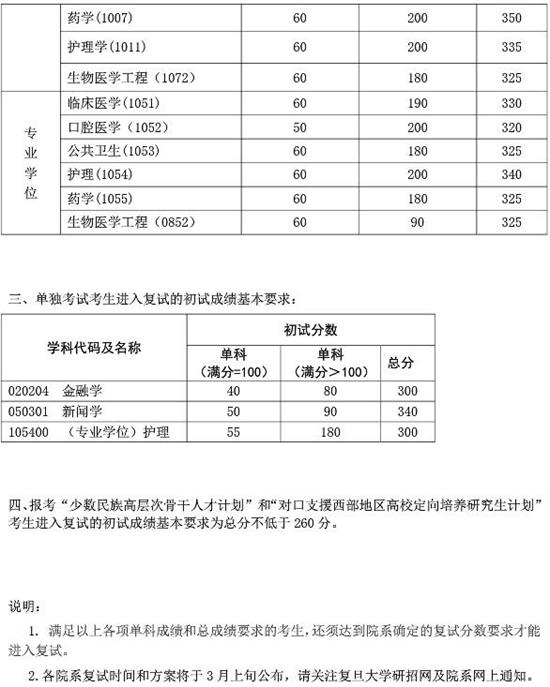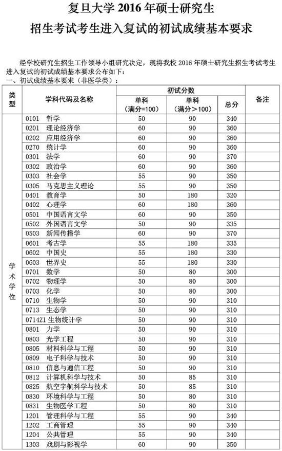 復(fù)旦大學(xué)2016年碩士研究生招生考試考生進(jìn)入復(fù)試的初試成績基本要求: