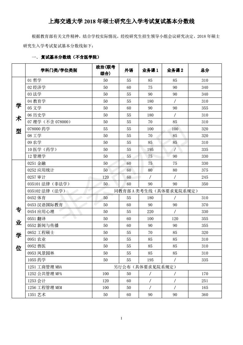 上海交通大學2018年碩士研究生入學考試復試基本分數線